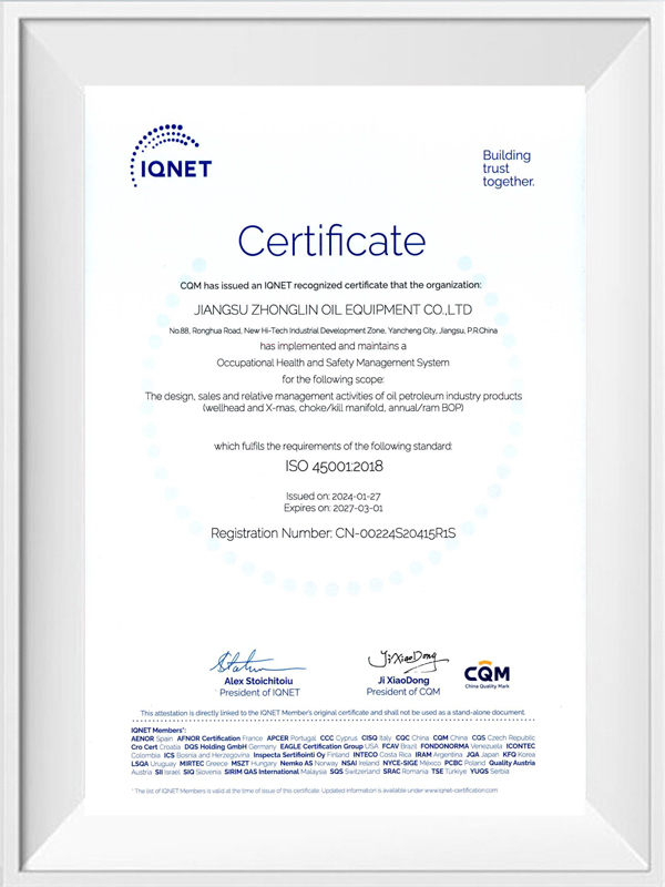 L'azienda ha superato l'audit API, è stata certificata API e ha ottenuto il diritto di utilizzare il monogramma API. La progettazione e la produzione sono conformi allo standard API. Inoltre, anche Jiangsu Zhonglin Oil Equipment Co., Ltd. è stata certificata ISO.